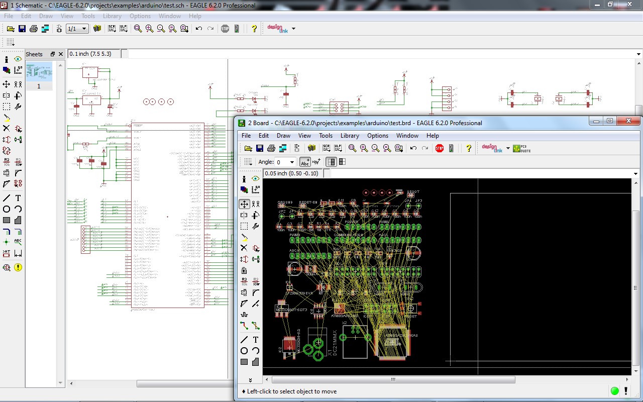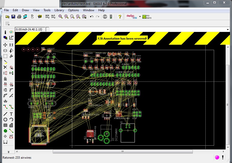From this stage onwards EAGLE performs Back&Forward Annotation. This function transfers each action executed in the Schematic Editor automatically into the Layout and vice versa: Let’s say you add a new component in the Schematic – it will automatically appear in the Layout Editor. Or connect two pins with a net – you will immediately see the corresponding airwire in the Layout. But please remember! For Back&Forward Annotation to work you must have Schematic and Layout both open together all the time. If you close one of the windows by mistake EAGLE will warn you with a clear message in the Editor window.
