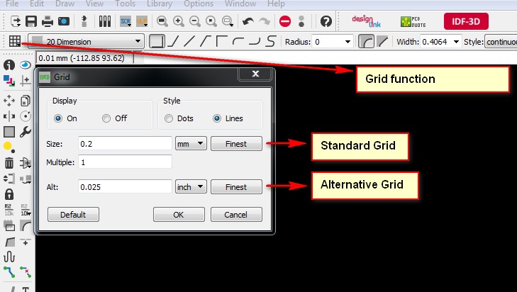 2. Before you move the components, select the correct grid to avoid problems with design rules. Click on the GRID icon to select the grid that matches the components. Place components with a mm footprint on a metric grid and components with an inch footprint on an inch grid. Enter an Alt(ernative) grid value if you want to use two different grids. You can then switch quickly between them. You can use metric and imperial grids in the same layout if required by different components. Or set two grids in the same unit; for example, 0.2 mm to rout racks for fine components and 0.4 mm where there is more space available. As a general rule keep the grid as large as you can, allowing for the requirements of the finer components.