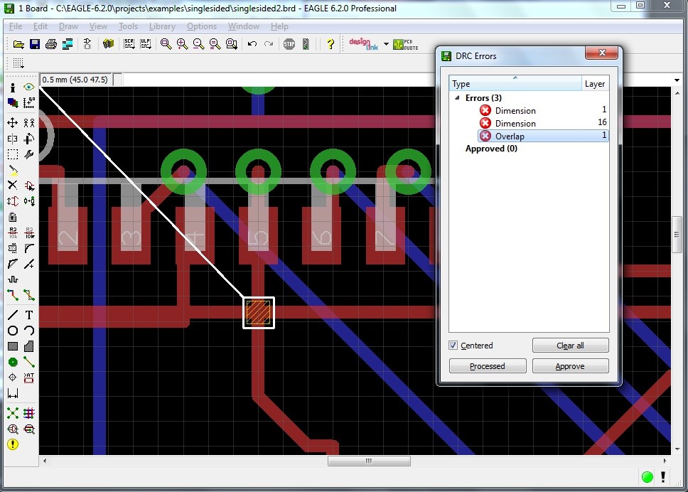7. Use the DRC button to run a Design Rule Check (DRC) from time to time to make sure that all rules are met. If there are errors, EAGLE shows you where to look.