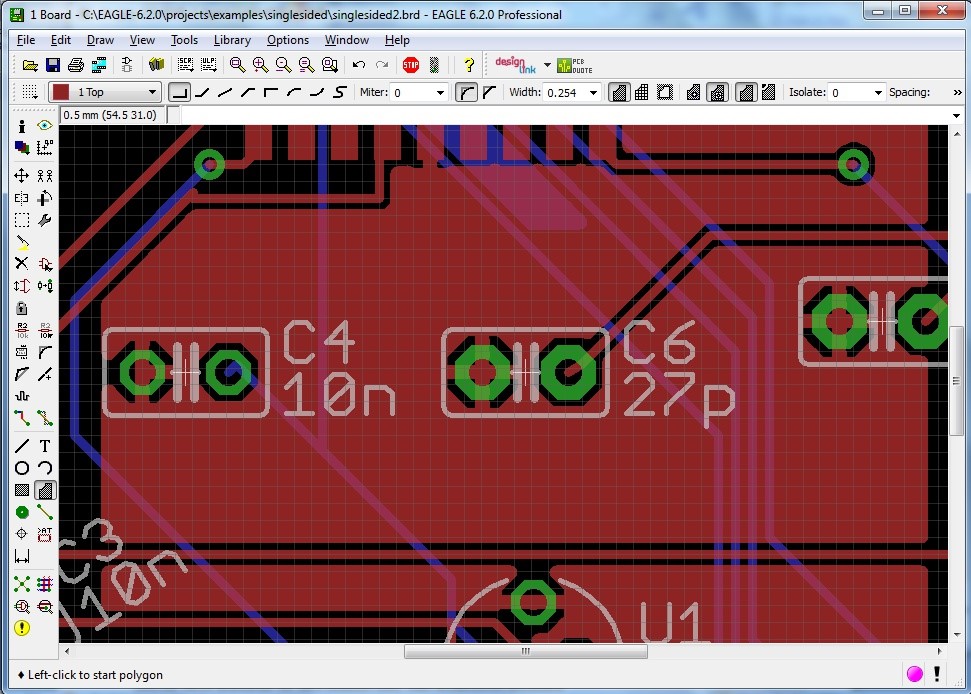 9. To draw copper planes (sometimes called “copper fill” or “copper flood”) use the POLYGON command. First draw the contour of the copper area with POLYGON, then name it the same as the signal it should be connected to. Run RATSNEST. The polygon will be calculated and the copper area displayed. Objects that belong to the same signal will be connected through thermal pads, and unconnected signals will be isolated.