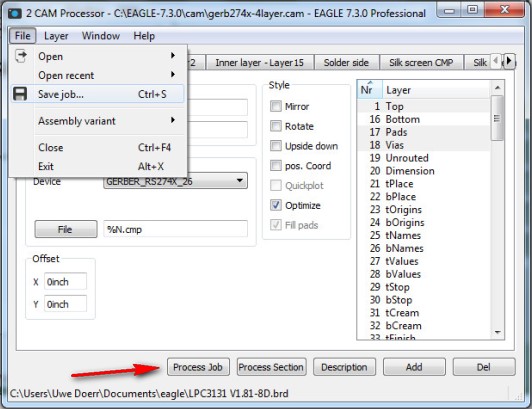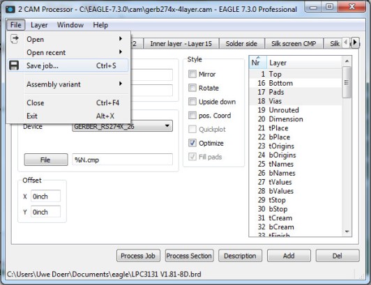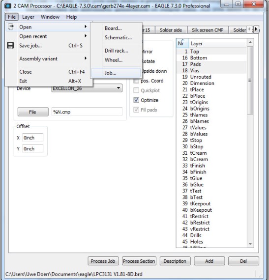 In File – Open –Job you can select a predefined or matching Job-File. The Job-File contains all the steps needed for automatic generation of output data. All you need to do is to define which layers to use.