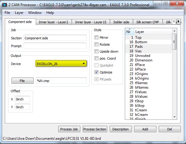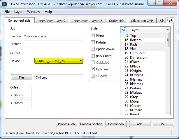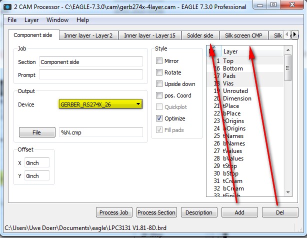 To add a layer to the CAM-Processor job click Add, select the Layer you need, change the Section to the correct name, select the Device and the matching File extension then save it.