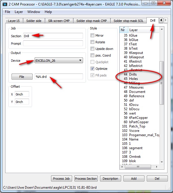 Select the same Device setting, 2.6 Inch as for the Gerber files. This ensures that layout and drill data match exactly on the finished PCB. In the right menu you can see that Layers Drill and Holes are combined for drilling.